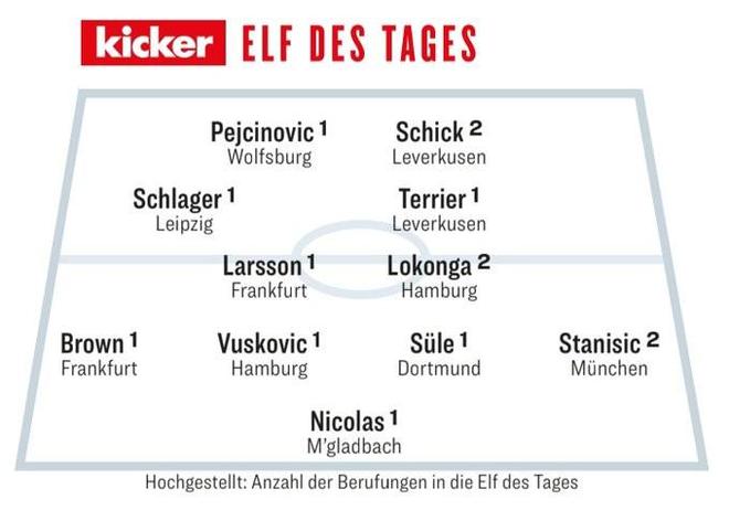 中場:施拉格爾(萊比錫)、胡戈-拉松(法蘭克福)、洛孔加(漢堡)、泰里耶(勒沃庫森)